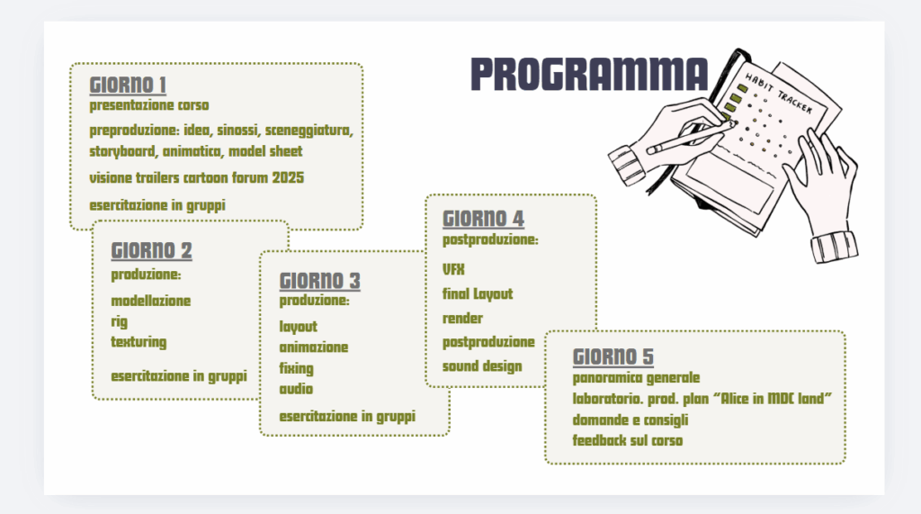 Il corso alterna parti teoriche ad esercitazioni pratiche in gruppo che simulano alcuni dei processi produttivi. Tra le esercitazioni pratiche, sono previsti dei laboratori specifici incentrati sulla creazione del Production Plan di Alice in MDC land, un cortometraggio animato che sarà il frutto di una serie di corsi di animazione firmati Manifatture Digitali Cinema. In particolare, si studieranno le sequenze del corto che verranno realizzate in 3D, per definirne professionalmente tempistiche, costi e dipartimenti coinvolti. Al termine del corso, avrai una visione globale della pipeline di una produzione 3D.